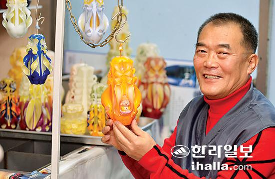 ▲수공예 양초공예가인 임봉환씨가 제주시 삼도1동 작업실에서 작품활동에 집중하고 있다. 일곱색깔의 파라핀에서 자연의 색을 만들어내는 그의 작품에 대한 열정은 겨울 추위속에서도 뜨겁기만 하다. 강희만기자