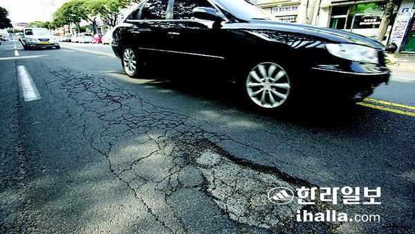 ▲제주시 삼도동 간선도로가 심하게 훼손돼 운전자들의 안전운행을 위협하고 있다.