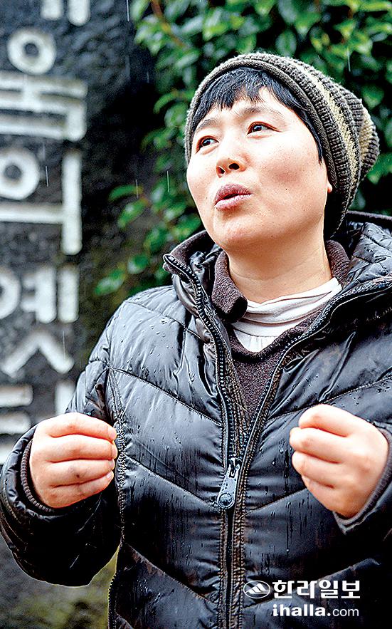 ▲풍천초 유학센터가 들어설 어멍아방잔치마을 입구에 선 강성분씨. 어멍아방잔치마을은 폐교인 신풍분교와 이웃해 있어 '배움의 옛터' 표지석이 세워져 있다. 강경민기자
