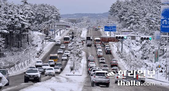 제주지방기상청 관계자는 "중산간 이상 지역에선 많은 눈이 쌓인데다 일부 도로는 결빙구간이 있고, 교통안전에 각별히 유의해야 한다"고 말했다.