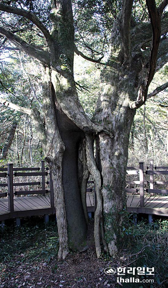 ▲두 개의 비자나무가 한몸으로 자라는 연리목