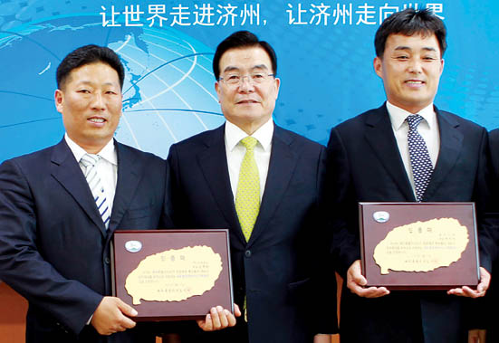 ▲우근민(가운데) 도지사가 가맹본부 인증패를 전달하고 있다.
