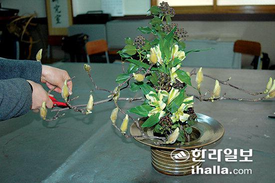 ▲신희숙 씨가 목련 나뭇가지를 다듬고 있다. 수반 위에 목련, 송악, 알스트로메리아가 조화롭게 어우러져 있다. 김지은기자