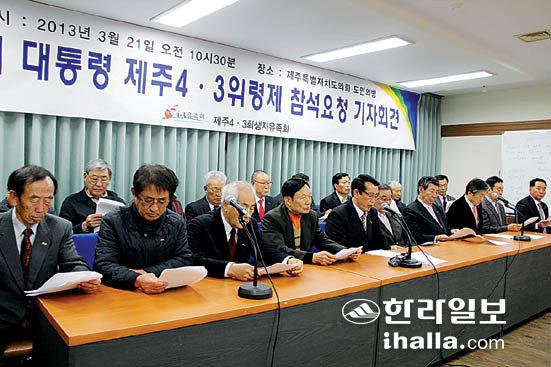 ▲제주4·3유족회가 21일 도의회 도민의 방에서 기자회견을 갖고 박근혜 대통령의 위령제 참석과 함께 정부의 적극적인 관심을 요구했다. 강봄기자