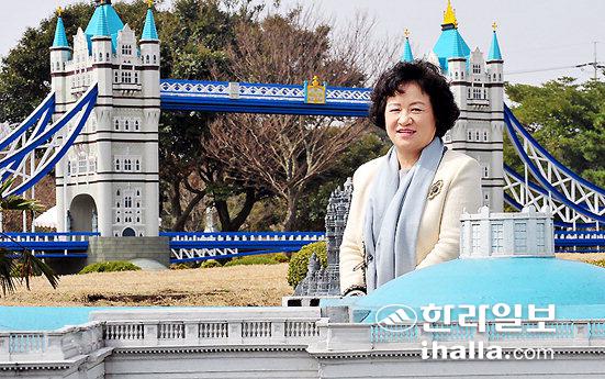 ▲박경임 대표가 제주미니랜드의 야외 전시 작품 사이에서 환히 웃고 있다. 박 대표는 최근 사설관광업계의 위기를 '제주의 자존심 문제'라며 어려움을 타개하기 위해선 불신이 없어져야 한다고 했다. 강희만기자 photo@ihalla.com