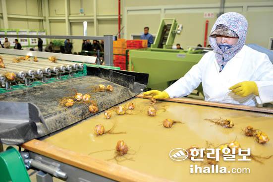 ▲지난해부터 국제식물 신품종 보호동맹이 본격 발효되면서 종자를 둘러싼 소리없는 전쟁이 벌어지고 있다. 이에 제주자치도는 씨드밸리프로젝트를 본격 가동해 종자주권 확보에 나서고 있다. 사진은 백합 종구 작업을 하고 있는 모습. 강경민기자