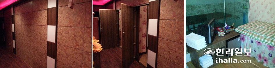 단속된 한 업소. 벽으로 위장된 밀실과 밀실 문을 연 모습, 그리고 밀실 내부에 있는 침대 및 욕실. 사진=제주지방경찰청 제공