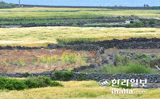 ▲푸름이 가득한 보리밭과 검은 돌담이 어우러진 풍경이 한 폭의 그림을 연상케 한다. 제주시 외도동에는 보리밭 주변으로 한 줄로 쌓아올린 외담의 모습을 볼 수 있다. 외담은 제주 밭담에서 가장 많은 비중을 차지하는 유형이다. 강경민기자