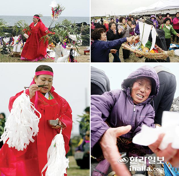 ▲칠머리당영등굿보존회 회원들이 올해 하도리 각시당에서 치러진 영등맞이굿을 함께 했는데 이용옥 큰심방이 요왕질침을 집전하고 있다. 또한 단골 씨드림과 뱃놀이를 하는 모습. 김명선기자