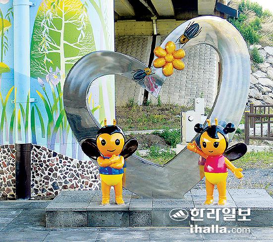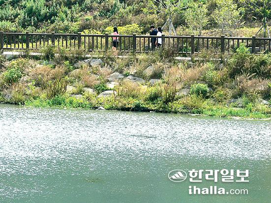 지난 5일 탐방로를 걷기 위해 찾은 예래생태체험관 앞 작은 연못에는 물레방아가 힘차게 돌아가고 있었다. 햇살 받으며 물소리를 쫓듯 걸어가자 목재로 만든 흔들그네 2개가 나란히 놓여 있다. 흔들리는 마음을 붙잡고 습지 사이로 놓인 길을 따라 걸으면 사자 형상을 한 포토존이 놓여있다. 사자 모형에 마을을 상징하는 반딧불이 모형이 앉아있다.