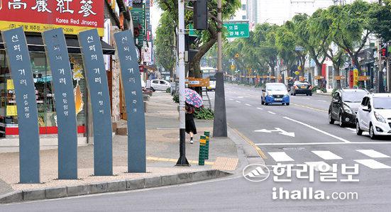 ▶문화·테마없는 테마거리=하지만 상당수의 테마거리는 지역문화와 특성을 반영하지 못하는 것이 현실이다. 실제로 신제주 문화칼라 사거리에서 그랜드호텔 사거리 구간에 조성된 '신화의 거리'는 이름과 장소적 연계성이 떨어져 시민들조차 고개를 갸우뚱한다. 인도 바닥의 제주어 속담 등은 조잡한 이미지를 심어주는데다 일부 조형물은 훼손된 채 관리마저 제대로 안되고 있다. 중앙로 일원의 '빛의 거리', 남문로에서 탑동사거리에 이르는 '자연의 거리', 산지천~칠성통 일대의 '영화의 거리' 등도 마찬가지다. 사업 내용도 대부분 도로포장과 경관 조명시설, 조형물, 표지판 설치 등 대동소이하다. 그러다 보니 국적불명의 거리, 문화와 테마가 없는 테마거리라는 비판이 줄곧 제기돼 왔다. 게다가 컨텐츠조차 빈약한 실정이어서 지역특성과 지역상권을 연계 지역경제 활성화를 유도해보자는 당초 취지는 상당부분 퇴색됐다.
