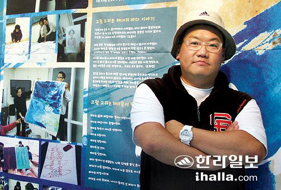 ▲해녀들의 삶을 표현하는 최적의 방법으로 그림 그리는 해녀 사업을 기획한 '문화공동체 서귀포사람들'의 안광희 대표가 잠시 포즈를 취하고 있다. 강봄기자