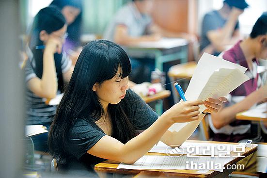 ▲2012 JDC 전국 중·고등학생 논술대회에서 금상을 수상했던 최진실 학생은 논술을 준비하는 후배들에게 대범해지라고 조언했다. 사진은 지난해 7월 제주제일고에서 열린 JDC 논술대회 모습. 사진=한라일보 DB