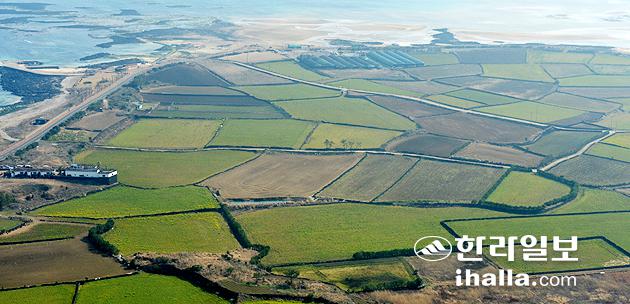 ▲화산활동으로 형성된 제주는 '돌의 나라'라고 해도 과언이 아니다. 산과 들은 물론 바다까지도 돌밭이었다. 경작을 위해선 어떤 방식으로든 불필요한 돌을 캐내어 쌓아둬야 했다. 사진은 하늘에서 본 제주시 구좌읍 종달리 경작지. 강경민기자