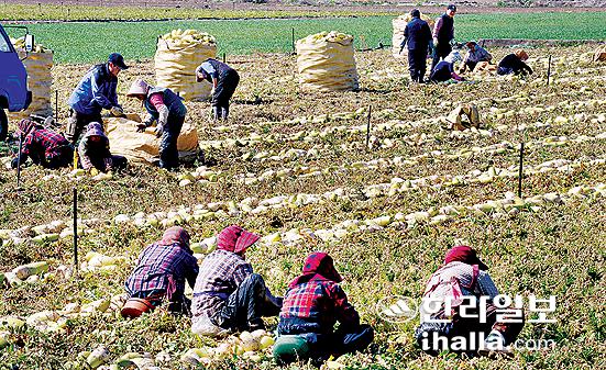 ▲겨울철 무 재배가 제주지방에서만 이뤄지면서 월동무가 투기작물로 변하며 갖가지 문제점이 속출하고 있다. 사진은 월동무 수확하는 모습. 사진=한라일보 DB
