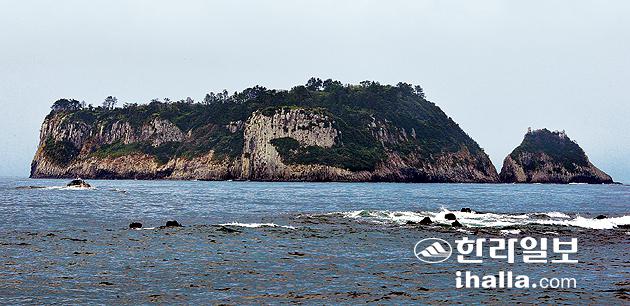 ▲범섬은 아름답게 잘 발달된 주상절리와 다양한 해양생물의 보금자리 역할을 해주면서 남방계 생물 다양성을 대표할 수 있어 문섬과 함께 천연기념물로 지정 보호되고 있다. 범섬의 경우도 문섬과 함께 다이버들이 즐겨찾는 명소로 자리매김하고 있다. 25일 오전 서귀포시 법환포구에서 바라본 범섬과 오른편 새끼섬. 강경민기자 photo6n6@ihalla.com