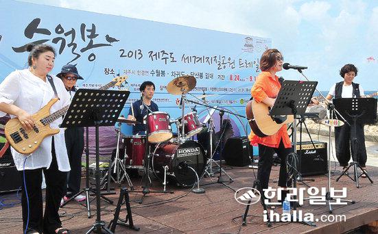 ▲2013 제주도 세계지질공원 수월봉 트레일 개막식 행사에서 한경면 지역주민 으로 구성된 '서쪽하늘' 밴드가 공연하고 있다. 강희만기자 photo@ihalla.com