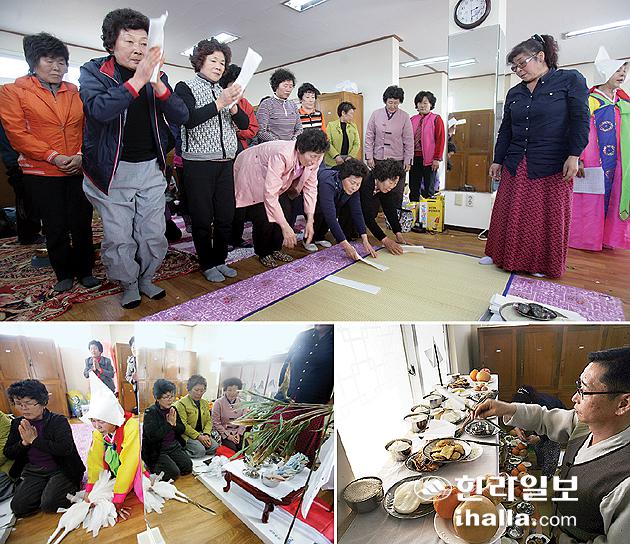 ▲겹경사를 맞은 위미2·3리 해녀들이 정성스레 영등굿을 집전하고 있다. 올해는 영등굿에 앞서 성주풀이 굿이 열렸다. 김명선기자