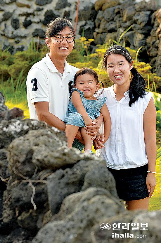 ▲도시생활을 접고 제주에서 인생 2막을 시작, 구좌읍 한동리에서 게스트하우스를 운영하는 함주현·최정은 부부와 딸 선율이가 올레에 서서 함박웃음을 짓고 있다. 강경민기자