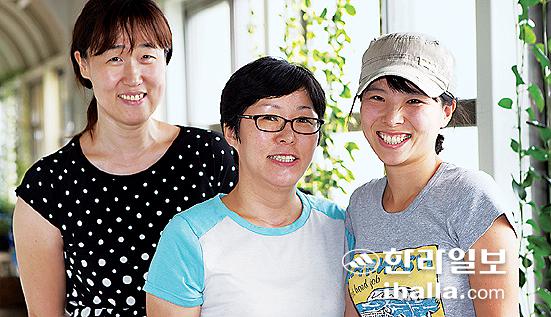 ▲제주시 중산간 마을에 위치한 시골 작은학교에서 학부모로 만나 새로운 삶을 일궈나가고 있는 김정단·김은정·오현수씨(사진 왼쪽부터). 김명선기자