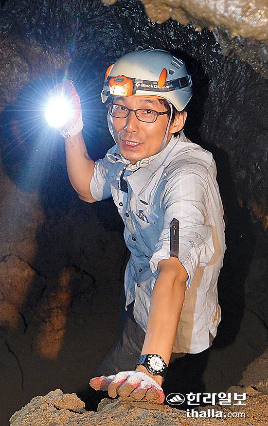 ▲대학원 시절 제주도 지질조사에 나서며 제주와의 인연을 이어가고 있는 전용문 박사. 사진은 동굴조사 모습. 강경민기자