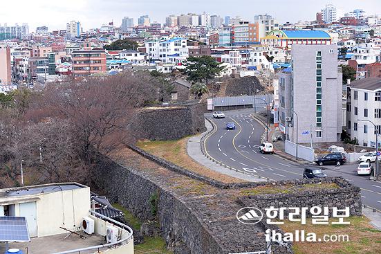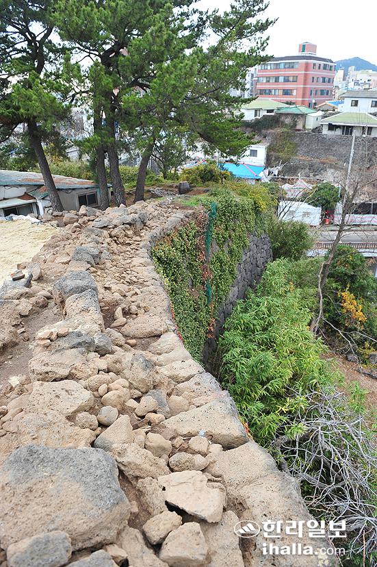 ▲제주시 오현단 인근에 남아 있는 제주성 성곽. 막대한 예산을 들여 정비했음에도 불구 원형을 제대로 살리지 못했다는 지적을 받고 있다. 강희만기자 photo@ihalla.com