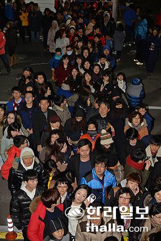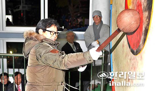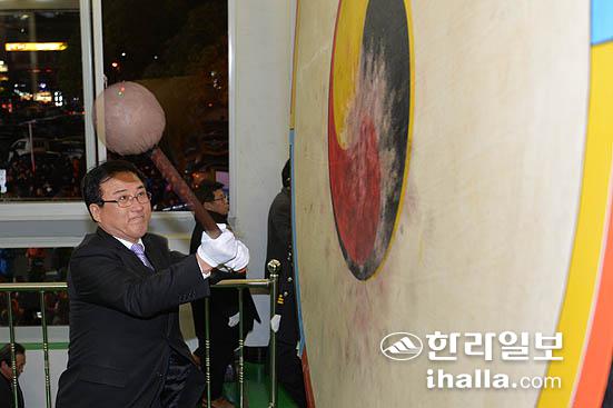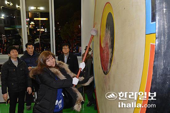 2014년 갑오년 새해를 맞아 1월1일 새벽 0시 제주시청에서 '제야의 용고 타고' 행사가 열린 가운데 한 이주민 여성이 새해를 알리는 북을 치고 있다./사진= 강경민기자 photo6n6@ihalla.com