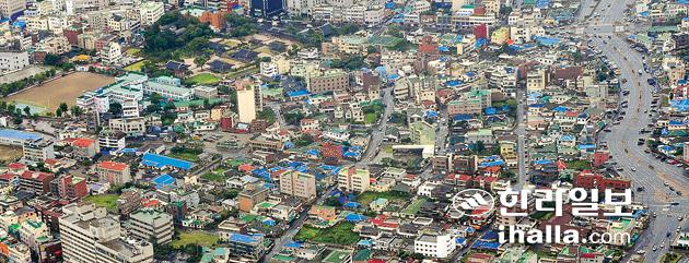 ▲제주시 무근성 일대 항공사진. 제주성은 무근성 일대에 자리했던 탐라시대 고성에서 고려·조선 시대를 거쳐 오늘날까지 이어지고 있다. 사진=한라일보 DB