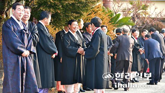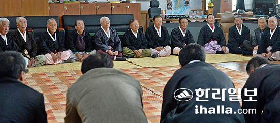1일 도내 각 마을마다 갑오년 합동세배 행렬이 이어진 가운데 서귀포시 신효마을회관(회장 오화천)에서 마을 주민들이 어르신들을 모시고 세배를 올리고 있다./사진= 강경민기자 photo6n6@ihalla.com
