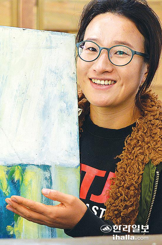 제주대학교 미술학과에 입학한 이후 18년째 줄곧 제주에 살고 있는 박소영씨가 자신의 작품 앞에서 포즈를 취하고 있다. 강경민기자