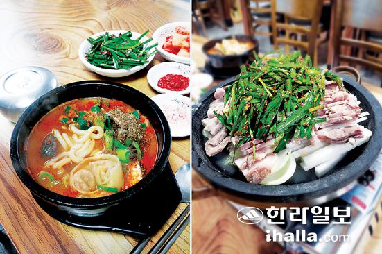 ▲왼쪽부터 '돌하르방 순대국'의 만두우동순대국과 돼지머리돌판수육. 최태경기자