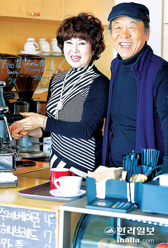 ▲커피 농부이자 바리스타인 김영한 대표와 이혜경 부부. 김 대표에 따르면 아내는 2년여 동안 제주에 적응하느라 무척이나 힘들었단다. 하지만 지금은 사진에서 처럼 활짝 웃을 수 있게 됐다고 귀띔했다. 강희만기자