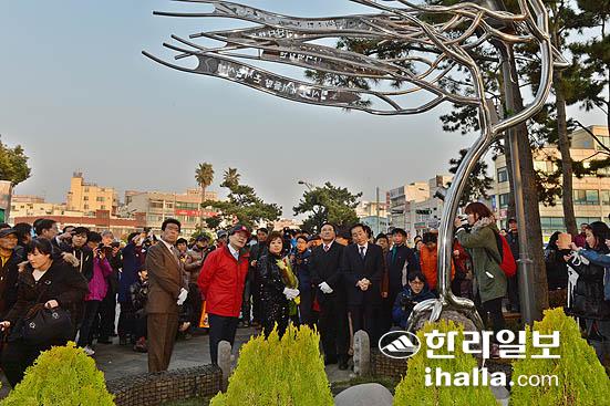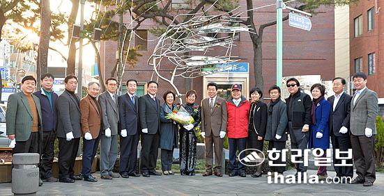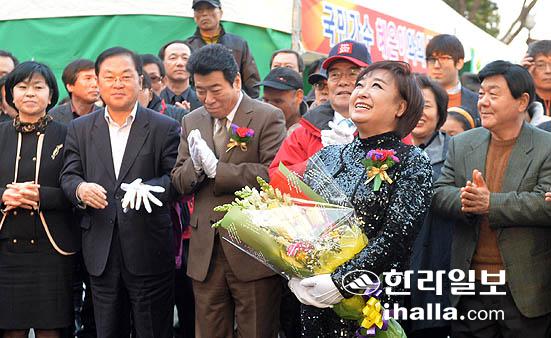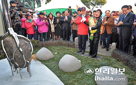 22일 제주시 산지천광장에서 제주 출신 가수 혜은이의 히트곡이 흘러나오는 '감수광 노래비' 제막식에서 혜은이씨가 환한 미소를 띠고 있다. 강경민기자 photo6n6@ihalla.com