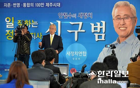 신구범 제주도지사 예비후보는 24일 도선관위에 예비후보 등록을 마친 뒤 제주시 노형동 선거사무소에서 기자회견을 가졌다. 강경민기자 photo6n6@ihalla.com