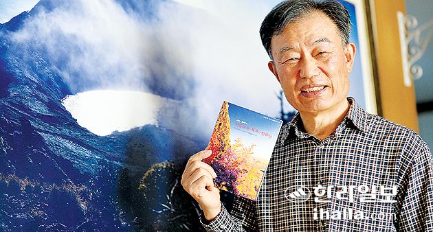 ▲제주 출장길에 만난 한라산의 매력에 빠져 제주로 이사와 28년동안 오르내리며 마주할 때마다 변화무쌍한 속살을 사진에 담아온 김봉선씨가 한라산 백록담 사진 앞에서 지난해 제작한 '아름다운 제주-한라산' 슬라이드쇼 CD를 들고 섰다. 강희만기자 photo@ihalla.com