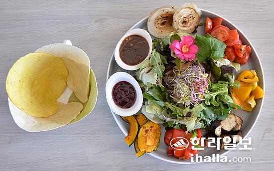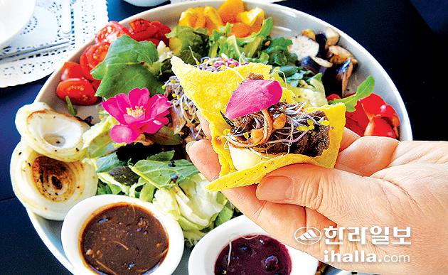 음식의 제멋은 보는 맛이라 했던가. 큰 쟁반에 놓여진 불고기샐러드는 우선 색깔이 곱다. 녹색의 신선채소에 방울토마토와 파프리카, 호박, 가지 등 빛깔 고운 야채들이 살짝 구워진채로 녹색의 그것들과 오묘하게 조화를 이룬다. 쟁반 가운데 채소에 살짝 감춰져 있는 불고기의 재료는 제주산 한우다. 젓가락으로 채소를 조금 들어올렸더니 불고기 양이 보기와 다르게 푸짐하다. 고기 한점과 야채를 젓가락으로 집어 먹었더니 맛있게 먹는 방법이 있단다. 함께 나온 전병의 일종인 또띠야를 적당하게 손으로 잘라 그 위에 불고기와 각종 야채를 올려놓은 뒤 소스를 찍어 먹는단다. 소스는 주인장 이씨가 시행착오끝에 만들었으며 야채만을 싸서 먹을때 클랜베리와인 소스를, 고기를 먹을땐 스테이크 소스를 찍어 먹어야 제맛이란다. 불고기 특유의 새콤달콤한 맛에 구운 채소와 생야채가 어우러진게 상상이상의 별미다.