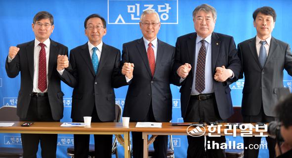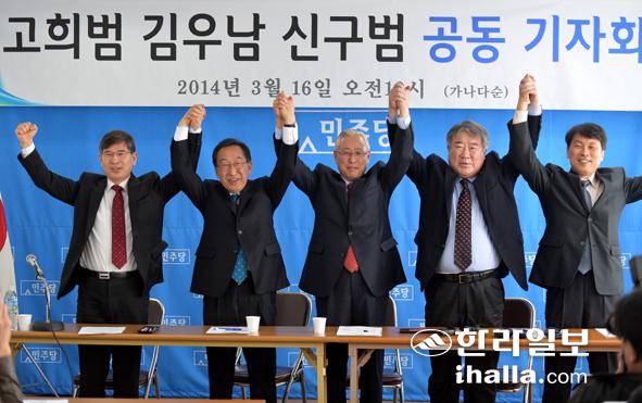 고희범 전 민주당 제주도당위원장과 김우남 국회의원, 새정치연합의 신구범 전 지사는 16일 민주당 제주도당사에서 기자회견을 갖고 제주도지사 선거 후보 경선 실시를 발표한 뒤 김재윤 도당위원장 및 오수용 새정치연합 제주책임자와 함께 만세를 외치고 있다. 강희만기자