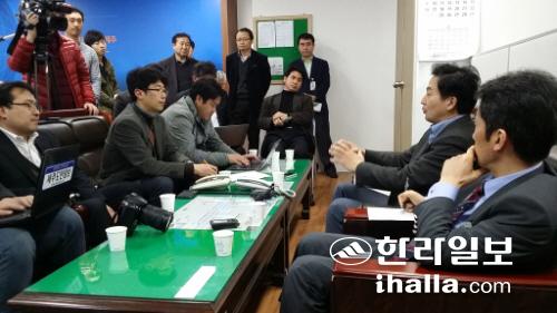 원희룡 예비후보가 18일 기자실을 찾아 간담회를 갖고 있다.