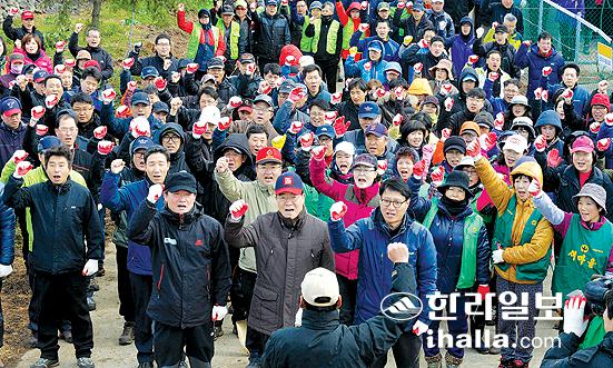 ▲14일 오전 제69회 식목일을 맞이하여 제주시 애월읍 하가리에서 제주도와 생명의 숲 살리기 나무심기 범도민 캠페인 추진 협약기관 등 200여명이 참가해 소나무재선충병 피해지 복원을 위한 '생명의 숲 살리기' 나무를 심었다. 사진=한라일보 DB