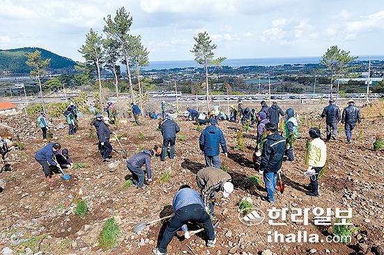 ▲14일 오전 제69회 식목일을 맞이하여 제주시 애월읍 하가리에서 제주도와 생명의 숲 살리기 나무심기 범도민 캠페인 추진 협약기관 등 200여명이 참가해 소나무재선충병 피해지 복원을 위한 '생명의 숲 살리기' 나무를 심었다. 사진=한라일보 DB