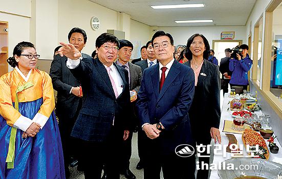 ▲제주도내 관광업계 종사자들과 도민들을 위한 중국어체험학습관이 27일 제주시자동차등록사무소(구 세무서)에 문을 열었다. 개관식에서 우근민 도지사와 장씬(張欣) 주제주중국총영사 등이 학습관을 둘러보고 있다. 강경민기자