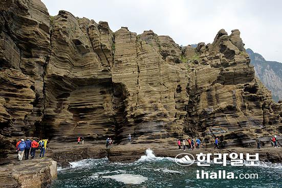 80만년 전 화산 활동으로 만들어진 제주 최고의 해안 경관지를 둘러보는 '산방산·용머리 해안 지질 트레일'이 5일 오전 서귀포시 안덕면 사계리 용머리 해안에서 개통식을 가져 참가자들이 탐방에 나서고 있다. 강경민기자 photo6n6@ihalla.com