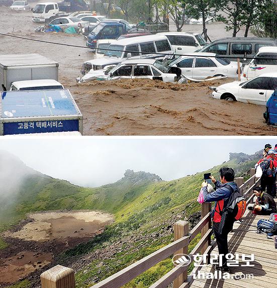 ▲지난 2007년 제주도에 밀려온 태풍 '나리'는 기록적인 폭우를 쏟으며 제주도 북부지역을 초토화시켰다(사진 맨 위). 반면 지난해에는 사상 초유의 혹독한 가뭄으로 백록담까지 바닥을 드러내는 등 온 섬이 말라붙어 큰 피해를 입었다(사진 아래). 한라일보 DB