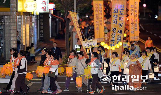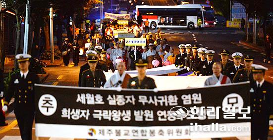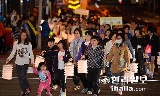 불기 2588년 부처님 오신날 연등행렬이 26일 제주시 종합경기장에서 탑동까지 펼쳐진 가운데 참가자들이 세월호 참사 희생자들의 극락왕생과 실종자 무사귀환을 기원하는 추모제 형식으로 진행했다.강경민기자
