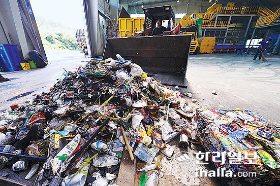 제주시 리사이클링센터에서 선별후 남은 매립용 폐기물의 모습. 강희만기자