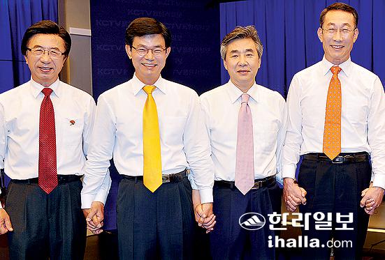 6·4지방선거를 보름여 앞두고 제주특별자치도교육감선거가 일부 후보들의 단일화 추진으로 요동치고 있다. 예비후보 7명에서 최종 '4파전'으로 압축된 가운데 앞으로 TV정책토론회 등이 향후 부동층 민심을 잡을 변수로 전망되고 있다. 사진 왼쪽부터 강경찬, 이석문, 양창식, 고창근 후보. 사진=한라일보 DB