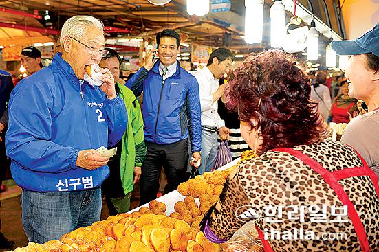 신구범 새정치민주연합 후보가 22일 제주시 민속오일시장을 찾아 도넛을 먹고 있다. 강경민기자