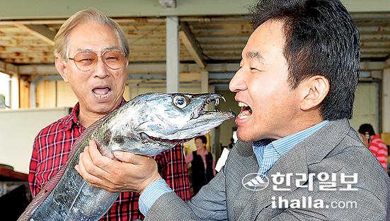 원희룡 새누리당 제주도지사 후보가 제주시 수협 위판장에서 경매가 이뤄질 대형갈치를 들어 입 크기를 비교해보고 있다. 강경민기자
