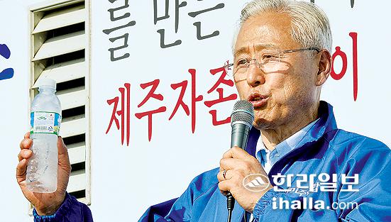 신구범 새정치민주연합 제주도지사 후보가 제주민속오일시장에서 삼다수정책에 관한 유세를 펼치고 있다. 강경민 기자