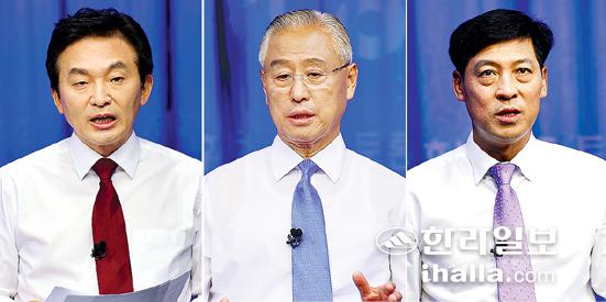 한라일보와 KCTV제주방송은 28일 오전 10시 KCTV스튜디오에서 제주도지사 후보 초청 토론회를 개최했다. 사진 왼쪽부터 새누리당 원희룡 후보, 새정치민주연합 신구범 후보, 통합진보당 고승완 후보. 사진= 강희만기자